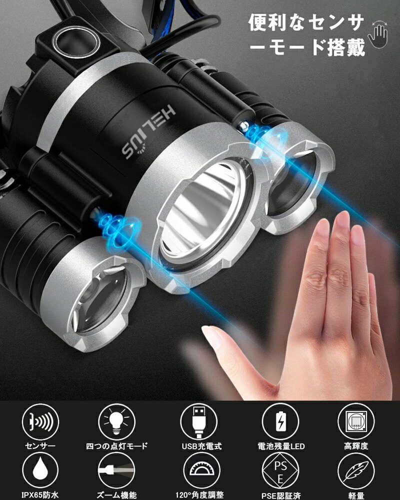 【超高輝度?人体センサー搭載】充電式LEDヘッドライトが3x CREE XM-L T6LEDチップを使用し、3灯で の高輝度を提供します。