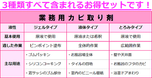 ※左記動画はセット商品内に含まれる「業務用カビとり剤3種類トライアルセット」です。